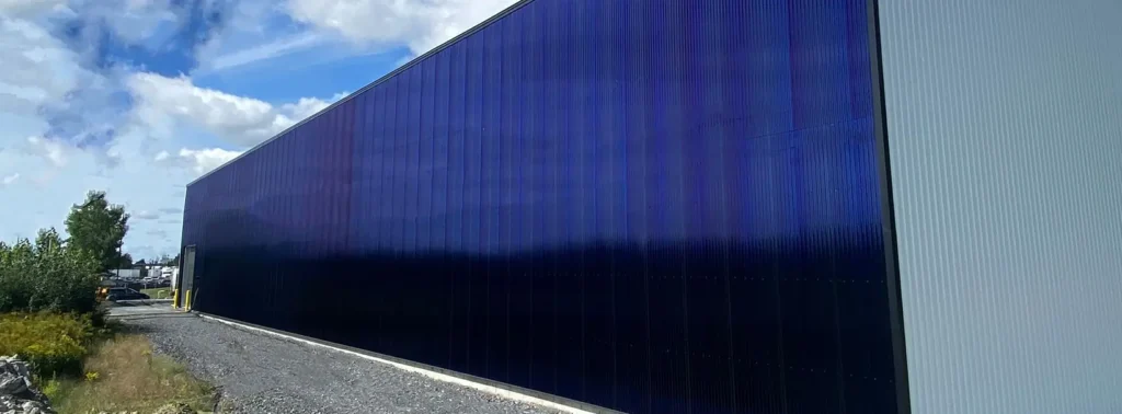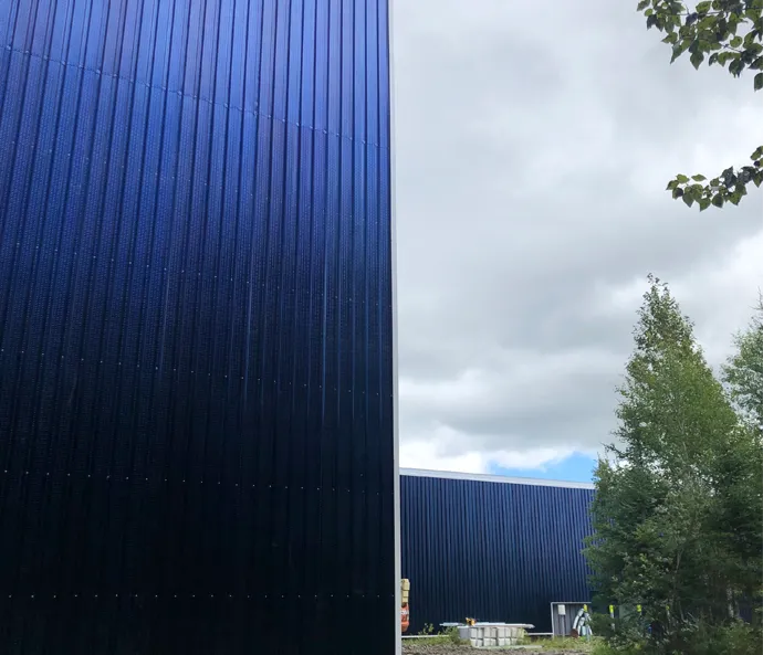 Unser Solarluftkollektor an Ihrer Fassade verwandelt direkt und höchsteffizient die Sonnenstrahlen in warme Luft. Über dezentrale EC-Ventilatorensysteme beheizen wir damit direkt ohne Verlust Ihr Gebäude.